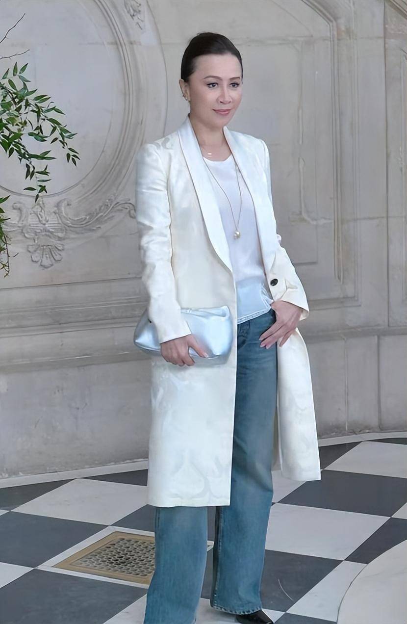 60岁的刘嘉玲一出场更是气场炸裂。别人为了上镜硬扛低温穿露肩装,她直接裹上珠光白刺绣风衣,内搭半透白上衣,下身配条蓝色牛仔裤,混搭得大胆又高级。