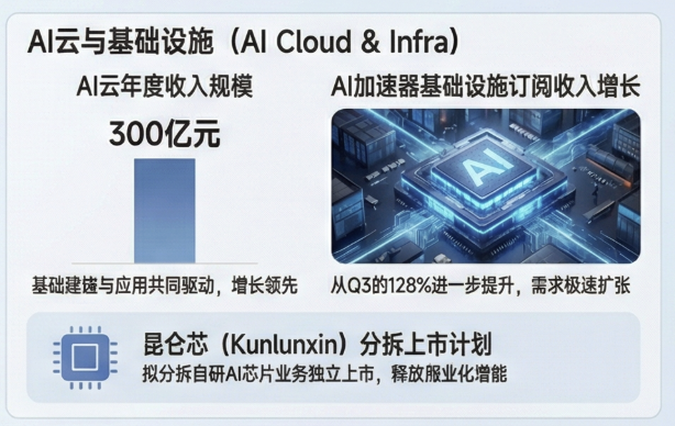 面对挑战,百度积极调整战略布局并强化股东回报。公司董事会已批准一项新的50亿美元股份回购计划,并首次推出股息政策。同时,百度宣布拟分拆旗下AI芯片子公司昆仑芯独立上市,以释放这项历时逾十年战略投资的潜在价值,推动核心AI业务进一步聚焦与发展。