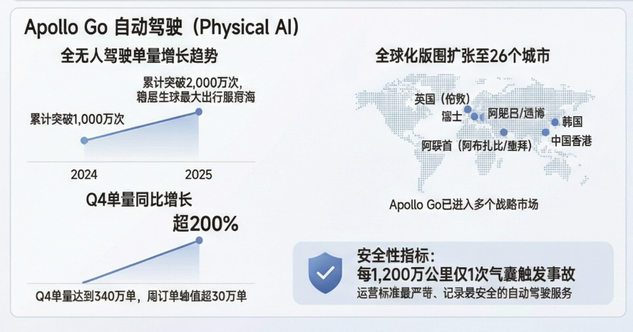 2025年是Apollo Go加速扩张的一年,我们在此过程中巩固了在运营规模上的领导地位,并在全球扩张方面取得了重大进展。我们继续快速扩大全无人驾驶运营规模,第四季度提供了340万次全无人驾驶运营行程,每周行程峰值超过30万次。总行程同比增长超过200%。截至2026年2月,累计向公众提供的出行服务已超过2000万次,牢固确立了我们在全球自动驾驶出行服务领域的领先地位。