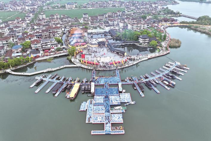 本报讯 4月10日,被誉为“江南唯一的水上庙会”的2026江南网船会在秀洲区王江泾镇莲泗荡风景区启幕。作为国家级非物质文化遗产,这一延续数百年的水上民俗盛典,吸引大运河沿岸江浙沪三地数千市民游客齐聚,体验一场水陆同欢、非遗传承、文旅融合的水上庙会,一同擦亮运河文化IP,推动文旅深度融合。