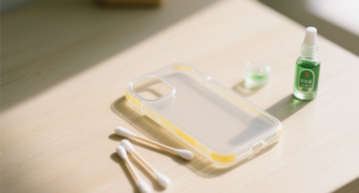 拿一根干净的棉签,蘸一点风油精,不用蘸太多,湿润就行,不然风油精会顺着缝隙流进去。然后对着手机壳上发黄的地方轻轻擦拭,就像平时擦桌子一样来回蹭。这里要注意,别太用力,尤其是边角比较薄的地方,容易蹭坏。
